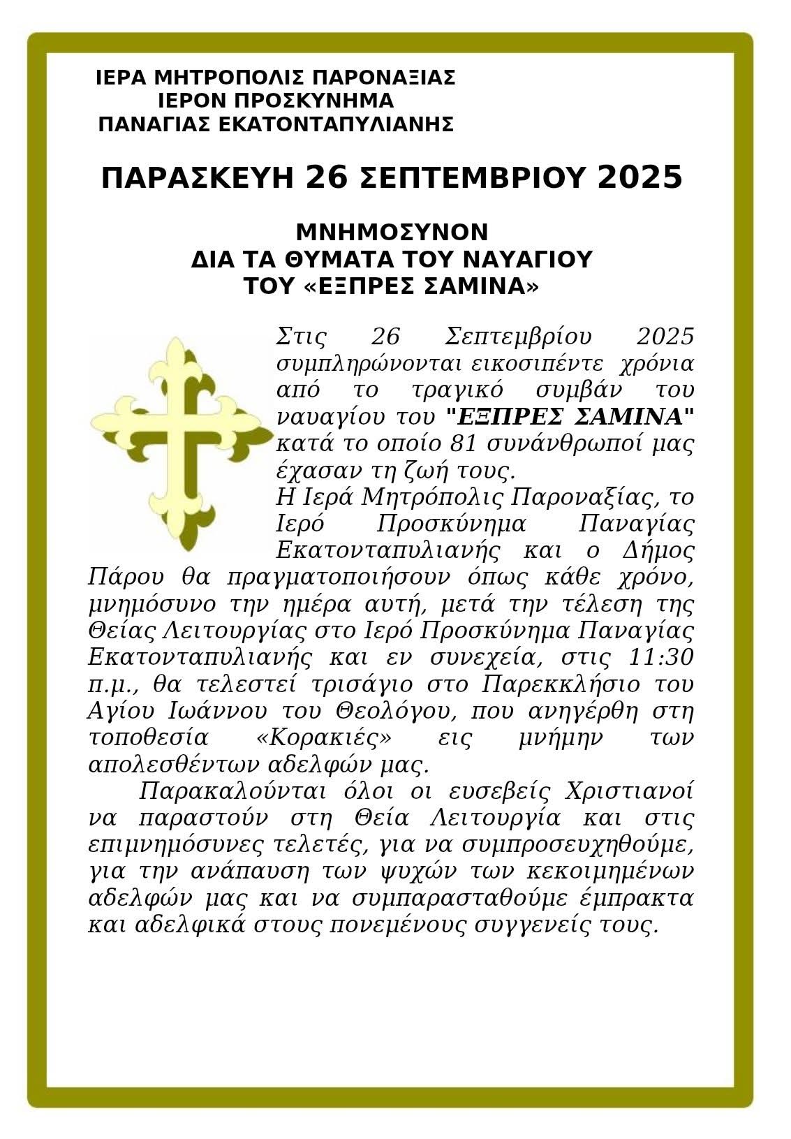 Να ενημερώσουμε πως σήμερα 26/9/2025, στην Παναγία την Εκατονταπυλιανή, θα τελεστεί μνημόσυνο για τα θύματα του τραγικού ναυαγίου.