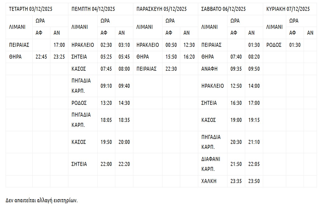 Σας ενημερώνουμε ότι λόγω της επερχόμενης κακοκαιρίας στα Δωδεκάνησα, τα δρομολόγια του Blue Star Chios από την Τετάρτη 03/12/2025 έως την Κυριακή 07/12/2025, θα τροποποιηθούν σύμφωνα με τον παρακάτω πίνακα: