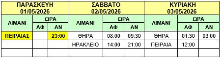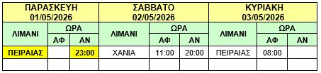 Λόγω της 24ωρης απεργίας της Πανελλήνιας Ναυτικής Ομοσπονδίας (Π.Ν.Ο.) αύριο Παρασκευή 01/05/2026, σας γνωρίζουμε ότι τα δρομολόγια των πλοίων Φ/Γ-Ο/Γ «ΝΕΑΡΧΟΣ Κ» και Φ/Γ- Ο/Γ «ΑΓΙΟΣ ΓΕΩΡΓΙΟΣ» θα εκτελεστούν αύριο Παρασκευή 01/05/2026 στις 23:00 ως κάτωθι πίνακες :