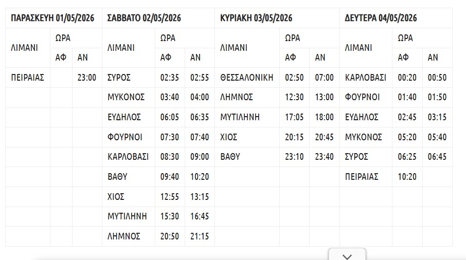 Το πλοίο θα αναχωρήσει από Πειραιά την Παρασκευή 01/05/2026 στις 23:00 και τα δρομολόγια μέχρι την Δευτέρα 04/05/2026, θα διαμορφωθούν σύμφωνα με τον παρακάτω πίνακα: