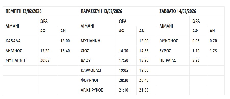 - Τα δρομολόγια του πλοίου από την Τετάρτη 11/02/2026, θα διαμορφωθούν ως ακολούθως: