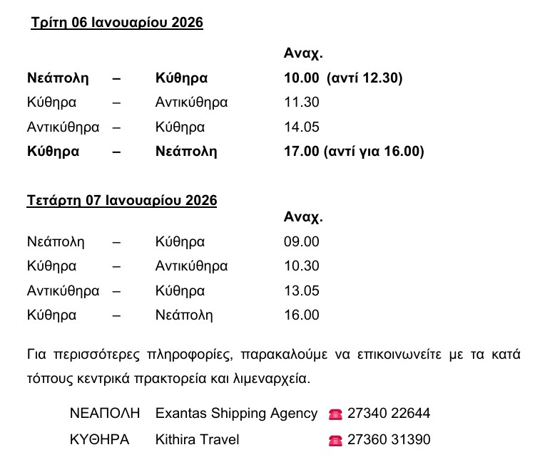 Σας ενημερώνουμε ότι, για την καλύτερη εξυπηρέτηση των συγκοινωνιακών αναγκών, το σημερινό δρομολόγιο της Δευτέρας 05/01/2026 προς ΑΝΤΙΚΥΘΗΡΑ που δεν εκτελέσθηκε λόγω δυσμενών καιρικών συνθηκών θα εκτελεσθεί αύριο Τρίτη 06/01/2026. Επίσης, το προγραμματισμένο δρομολόγιο της Πέμπτης 08/01/2026 για Αντικύθηρα θα εκτελεσθεί – κατόπιν έγκρισης – την Τετάρτη 07/01/2026. Τα δρομολόγια θα διαμορφωθούν ως ακολούθως: