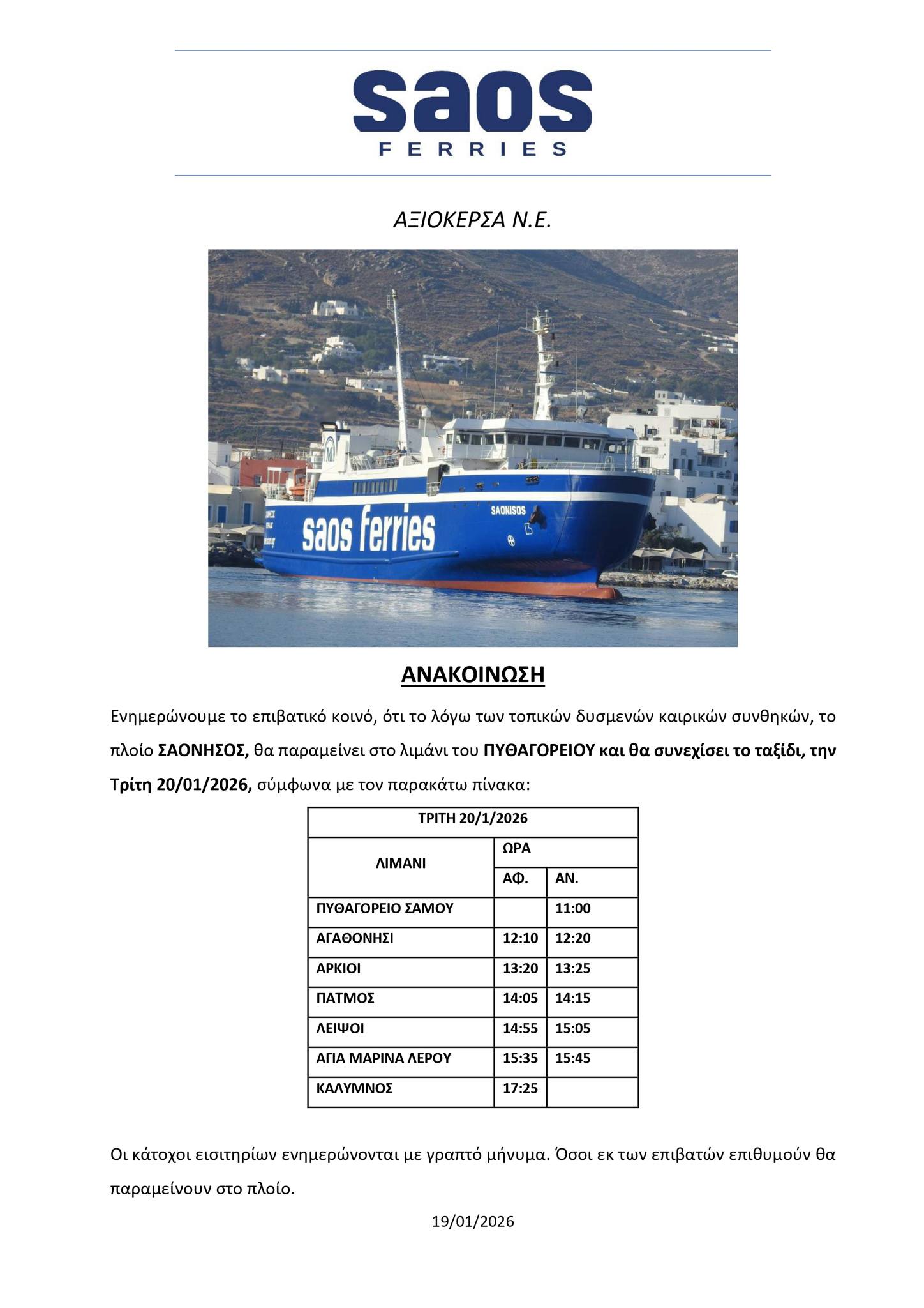 Αρχική Νέα Ακτοπλοΐα Διαμόρφωση των δρομολογίων του ΣΑΟΝΗΣΟΣ το χρονικό διάστημα 19/1-20/1 λόγω των δυσμενών... ΝέαΑκτοπλοΐα Διαμόρφωση των δρομολογίων του ΣΑΟΝΗΣΟΣ το χρονικό διάστημα 19/1-20/1 λόγω των δυσμενών καιρικών συνθηκών 19 Ιανουαρίου 2026 FacebookTwitterPinterestWhatsAppLinkedin ΠΑΡΟΜΟΙΑ ΑΡΘΡΑΠΕΡΙΣΣΟΤΕΡΑ ΑΠΟ ΤΟΝ ΔΗΜΙΟΥΡΓΟ Ανεκτέλεστα θα παραμείνουν τα δρομολόγια του AQUA JEWEL το χρονικό διάστημα 20/1-22/1 λόγω δυσμενών καιρικών συνθηκών Ο ΚΑΙΡΟΣ ΤΗΝ ΤΡΙΤΗ 20/1 Διαμόρφωση των δρομολογίων του BLUE STAR CHIOS το χρονικό διάστημα 20/1-25/1 λόγω των δυσμενών καιρικών συνθηκών