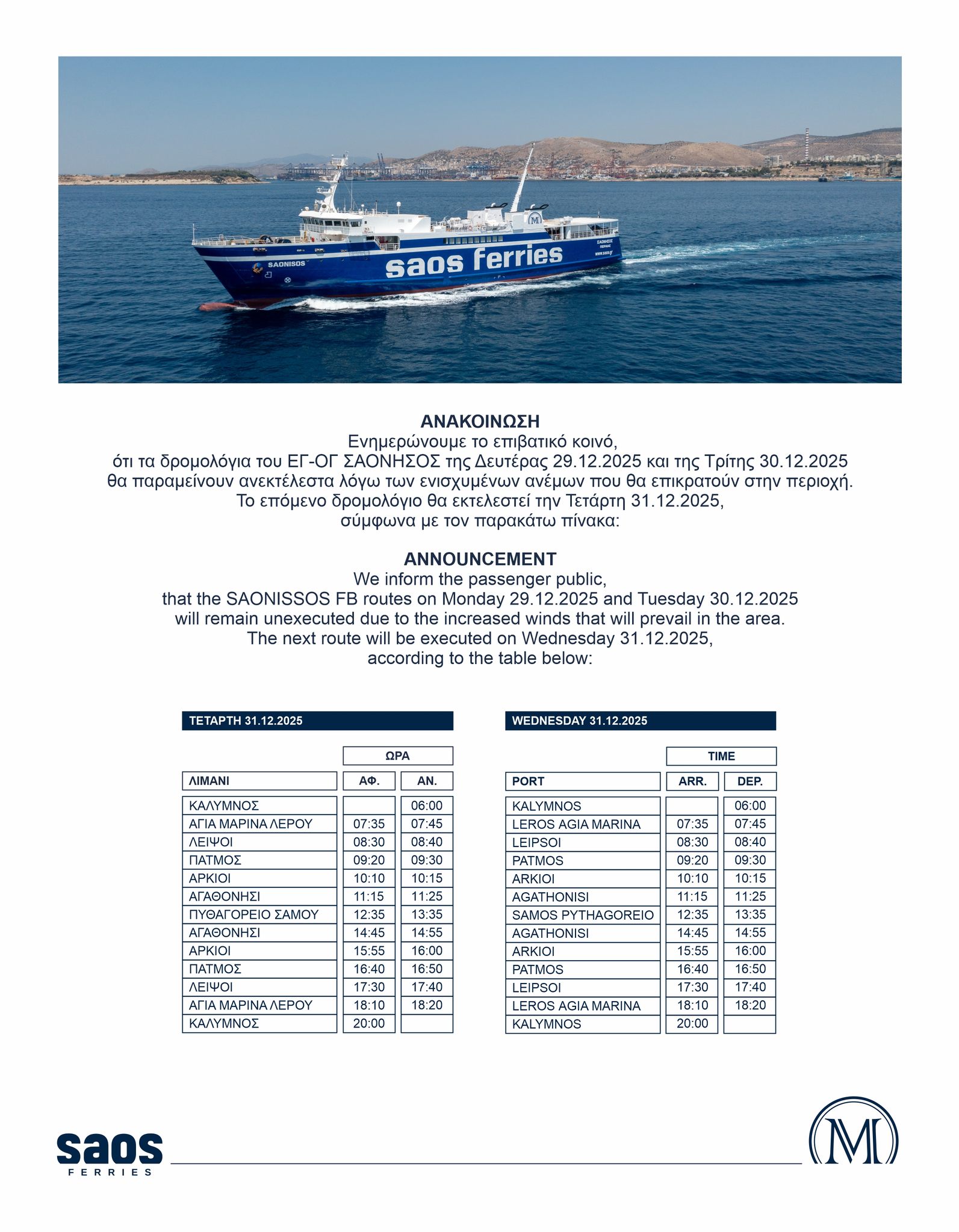 Αρχική Νέα Ακτοπλοΐα Διαμόρφωση των δρομολογίων του ΣΑΟΝΗΣΟΣ το χρονικό διάστημα 29/12-31/12 λόγω των θυελωδών... ΝέαΑκτοπλοΐα Διαμόρφωση των δρομολογίων του ΣΑΟΝΗΣΟΣ το χρονικό διάστημα 29/12-31/12 λόγω των θυελωδών ανέμων 28 Δεκεμβρίου 2025 FacebookTwitterPinterestWhatsAppLinkedin ΠΑΡΟΜΟΙΑ ΑΡΘΡΑΠΕΡΙΣΣΟΤΕΡΑ ΑΠΟ ΤΟΝ ΔΗΜΙΟΥΡΓΟ Σκληρό ροκ στον Αργοσαρωνικό Ο ΚΑΙΡΟΣ ΤΗΝ ΚΥΡΙΑΚΗ 28/12 Τροποποίηση του δρομολογίου του ΣΤΑΥΡΟΣ την Κυριακή 28/12