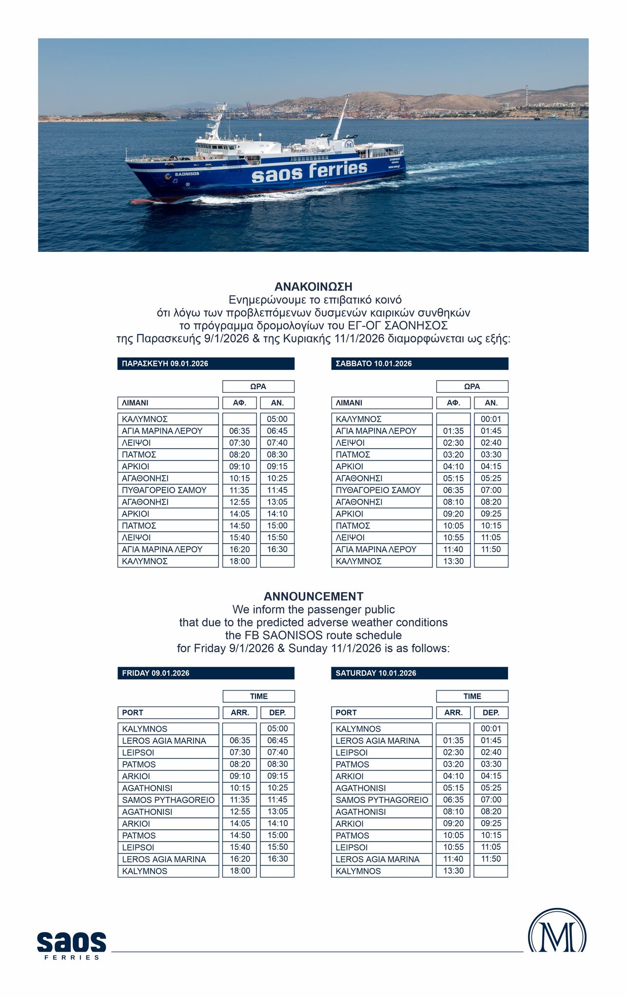 Αρχική Νέα Ακτοπλοΐα Διαμόρφωση των δρομολογίων του ΣΑΟΝΗΣΟΣ το χρονικό διάστημα 9/1-11/1 ΝέαΑκτοπλοΐα Διαμόρφωση των δρομολογίων του ΣΑΟΝΗΣΟΣ το χρονικό διάστημα 9/1-11/1 8 Ιανουαρίου 2026 FacebookTwitterPinterestWhatsAppLinkedin ΠΑΡΟΜΟΙΑ ΑΡΘΡΑΠΕΡΙΣΣΟΤΕΡΑ ΑΠΟ ΤΟΝ ΔΗΜΙΟΥΡΓΟ SUPERFAST FERRIES: Διαμόρφωση των δρομολογίων από Μπάρι στις 09.01 και προς Μπάρι στις 10.01.2026 λόγω δυσμενών καιρικών συνθηκών. Τροποποίηση δρομολογίου του DODEKANISOS PRIDE λόγω δυσμενών καιρικών συνθηκών Διαμόρφωση του δρομολογίου του ΤΑΛΩΣ το χρονικό διάστημα 10/1-11/1