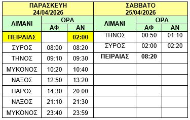 Φ/Γ-Ο/Γ “ΤΑΛΩΣ”: Λόγω δυσμενών καιρικών συνθηκών και καθυστερημένου κατάπλου του πλοίου μας Φ/Γ-Ο/Γ «ΤΑΛΩΣ» στο λιμένα του ΠΕΙΡΑΙΑ, σας γνωρίζουμε ότι το πλοίο θα αναχωρήσει από τον λιμένα του ΠΕΙΡΑΙΑ αύριο Παρασκευή 24/04/2026 στις 02:00 (αντί σήμερα Πέμπτη 23/04/2026 στις 20:00) προς ΣΥΡΟ – ΤΗΝΟ – ΜΥΚΟΝΟ – ΝΑΞΟ – ΠΑΡΟ, και το δρομολόγιο θα εκτελεστεί ως κάτωθι πίνακας :