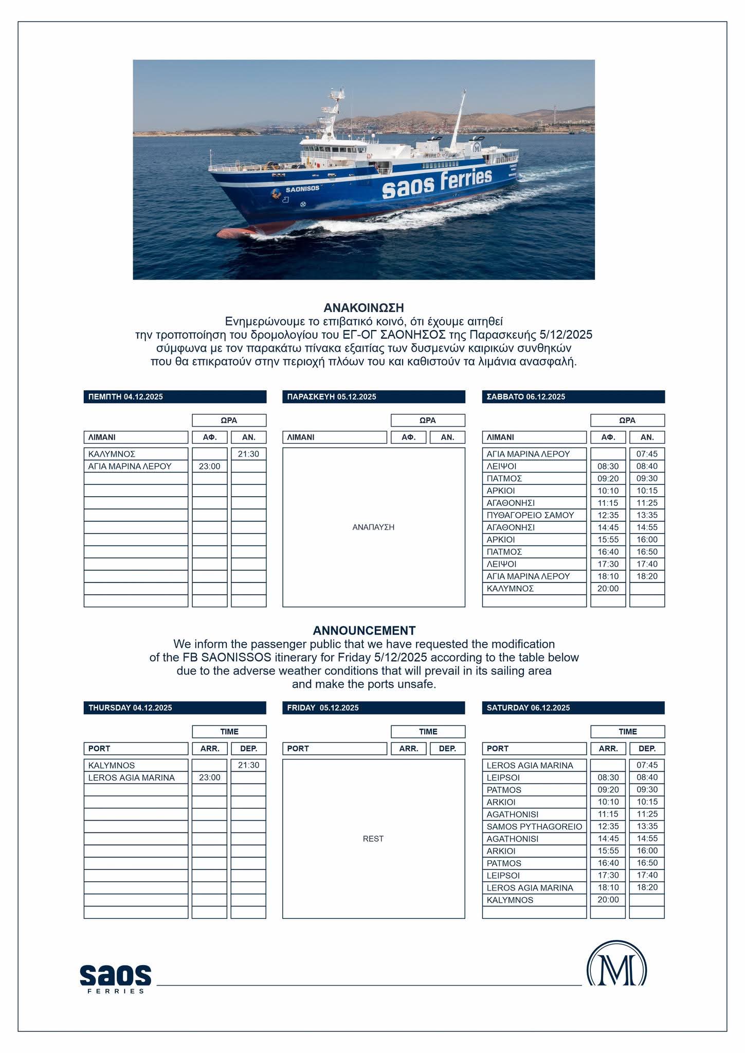 Αρχική Νέα Ακτοπλοΐα Διαμόρφωση του δρομολογίου του ΣΑΟΝΗΣΟΣ το χρονικό διάστημα 4/12-6/12