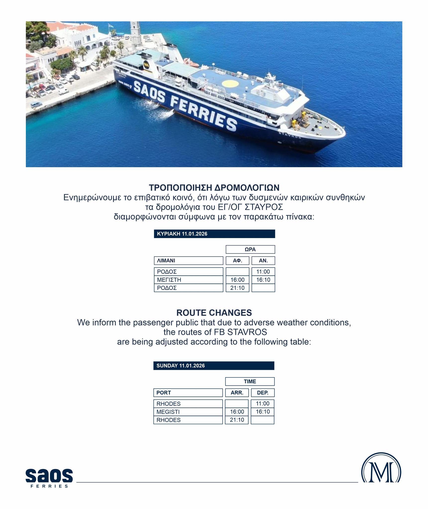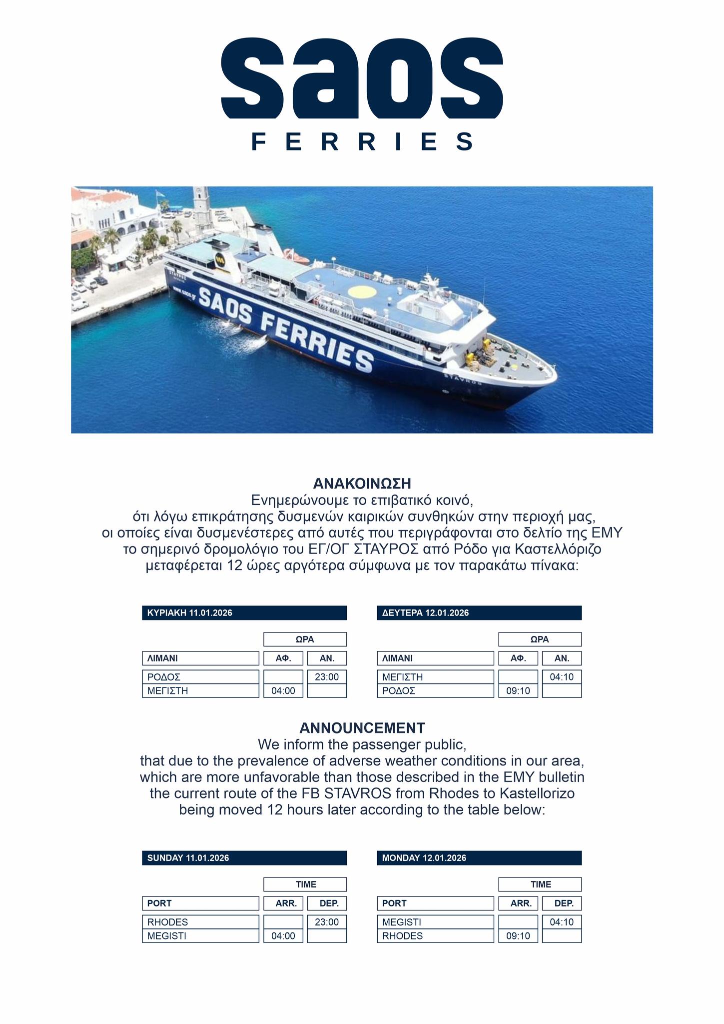 Αρχική Νέα Ακτοπλοΐα Διαμόρφωση του δρομολογίου του ΣΤΑΥΡΟΣ την Κυριακή 11/1 λόγω των δυσμενών καιρικών... ΝέαΑκτοπλοΐα Διαμόρφωση του δρομολογίου του ΣΤΑΥΡΟΣ την Κυριακή 11/1 λόγω των δυσμενών καιρικών συνθηκών 10 Ιανουαρίου 2026 FacebookTwitterPinterestWhatsAppLinkedin ΠΑΡΟΜΟΙΑ ΑΡΘΡΑΠΕΡΙΣΣΟΤΕΡΑ ΑΠΟ ΤΟΝ ΔΗΜΙΟΥΡΓΟ BLUE STAR DELOS: Στις 09:00 η αναχώρηση αντί για τις 07:25 σήμερα Κυριακή 11/1 λόγω των δυσμενών καιρικών συνθηκών Για δεξαμενισμό το ΕΛΥΡΟΣ ΜΙΝΩΙΚΕΣ ΓΡΑΜΜΕΣ: Απαγορευτικό απόπλου, λόγω των δυσμενών καιρικών συνθηκών, για τα KNOSSOS PALACE και FESTOS PALACE το Σάββατο 10/1
