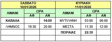 Φ/Γ-Ο/Γ “ΤΑΛΩΣ”: Λόγω δυσμενών καιρικών συνθηκών και προς εξυπηρέτηση συγκοινωνιακών αναγκών, σας γνωρίζουμε ότι το πλοίο Φ/Γ-Ο/Γ «ΤΑΛΩΣ» θα αναχωρήσει αύριο Σάββατο 10/01/2026 από ΚΑΒΑΛΑ στις 14:00 (αντί στις 09:00) προς ΛΗΜΝΟ – ΜΥΤΙΛΗΝΗ – ΜΕΣΤΑ – ΠΕΙΡΑΙΑ και το δρομολόγιο θα εκτελεστεί ως κάτωθι πίνακας :