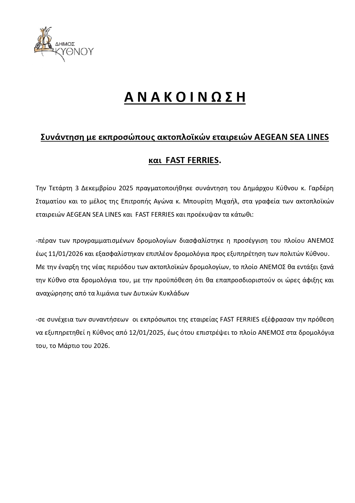 Αρχική Νέα Ακτοπλοΐα ΔΗΜΟΣ ΚΥΘΝΟΥ: Συνάντηση με εκπροσώπους ακτοπλοικών εταιρειών AEGEAN SEA LINES και FAST... ΝέαΑκτοπλοΐα ΔΗΜΟΣ ΚΥΘΝΟΥ: Συνάντηση με εκπροσώπους ακτοπλοικών εταιρειών AEGEAN SEA LINES και FAST FERRIES 10 Δεκεμβρίου 2025 FacebookTwitterPinterestWhatsAppLinkedin ΠΑΡΟΜΟΙΑ ΑΡΘΡΑΠΕΡΙΣΣΟΤΕΡΑ ΑΠΟ ΤΟΝ ΔΗΜΙΟΥΡΓΟ Ο ΚΑΙΡΟΣ ΤΗΝ ΤΕΤΑΡΤΗ 10/12 Ο.Λ.Β.: Ενημέρωση σχετικά με τον αποκλεισμό των εγκαταστάσεων του λιμένος από αγρότες την Τετάρτη 10/12 Στις 18:30 το απόγευμα, της Τρίτης 9/12, θα αναχωρήσει το BLUE STAR NAXOS, από το λιμάνι του Πειραιά, λόγω δυσμενών καιρικών συνθηκών-Διαμόρφωση δρομολογίων