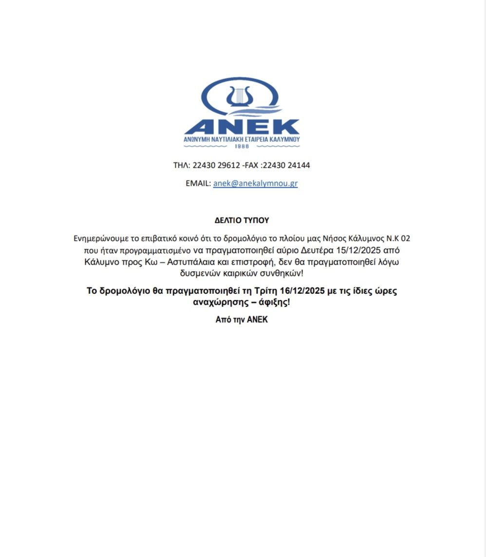 Αρχική Νέα Ακτοπλοΐα Για την Τρίτη 16/12 μεταφέρεται το δρομολόγιο του ΝΗΣΟΣ ΚΑΛΥΜΝΟΣ που ήταν... ΝέαΑκτοπλοΐα Για την Τρίτη 16/12 μεταφέρεται το δρομολόγιο του ΝΗΣΟΣ ΚΑΛΥΜΝΟΣ που ήταν να πραγματοποιηθεί στις 15/12 και αναβάλλεται λόγω δυσμενών καιρικών συνθηκών 14 Δεκεμβρίου 2025 FacebookTwitterPinterestWhatsAppLinkedin ΠΑΡΟΜΟΙΑ ΑΡΘΡΑΠΕΡΙΣΣΟΤΕΡΑ ΑΠΟ ΤΟΝ ΔΗΜΙΟΥΡΓΟ ΠΕΝΕΝ: Στην εφοπλιστική και κυβερνητική αδιαλλαξία απαντάμε με νέα απεργία 48 ωρών στα πλοία RO/RO Β. Κικίλιας: «Επενδύσεις σε ναυτιλία και λιμενικές υποδομές, η μεγάλη ευκαιρία της ελληνικής οικονομίας για ανάπτυξη» Μπαμπά, μπαρκάρω