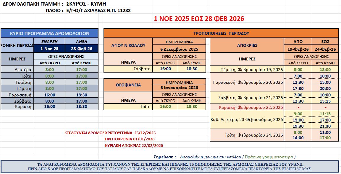 Δύο και πλέον μήνες πριν το τέλος του 2025, η Σκύρος Ναυτική Εταιρεία ανακοινώνει έγκαιρα όλα τα δρομολόγια μέχρι και τον Οκτώβριο του 2026!