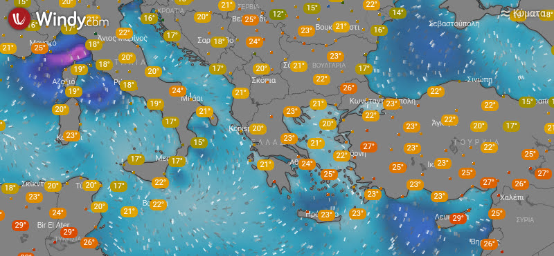 Οι άνεμοι θα πνέουν αρχικά από βορειοδυτικές διευθύνσεις με την ένταση τοπικά να φτάνει και τα 6 μποφόρ στα ανατολικά τμήματα της χώρας, όμως το απόγευμα κι από τα βόρεια θα στραφούν σε ανατολικούς – νοτιανατολικούς με την ένταση να μην ξεπερνάει τα 4 με 5 μποφόρ. Η θερμοκρασία θα κυμανθεί στα δυτικά από 16 έως 28 βαθμούς κελσίου ( στα βορειότερα τμήματα έως 25 βαθμούς), στα βόρεια από 11 έως 27 βαθμούς κελσίου (στη δυτική Μακεδονία η ελάχιστη θα είναι στους 7 βαθμούς και η μέγιστη στους 22 βαθμούς), στα κεντρικά και ανατολικά από 12 έως 29 βαθμούς κελσίου, ενώ στα νησιά του Αιγαίου η μέγιστη θα φτάσει τους 27 βαθμούς κελσίου (πιθανόν στην Κρήτη και τα Δωδεκάνησα τοπικά να φτάσει τους 30 βαθμούς).