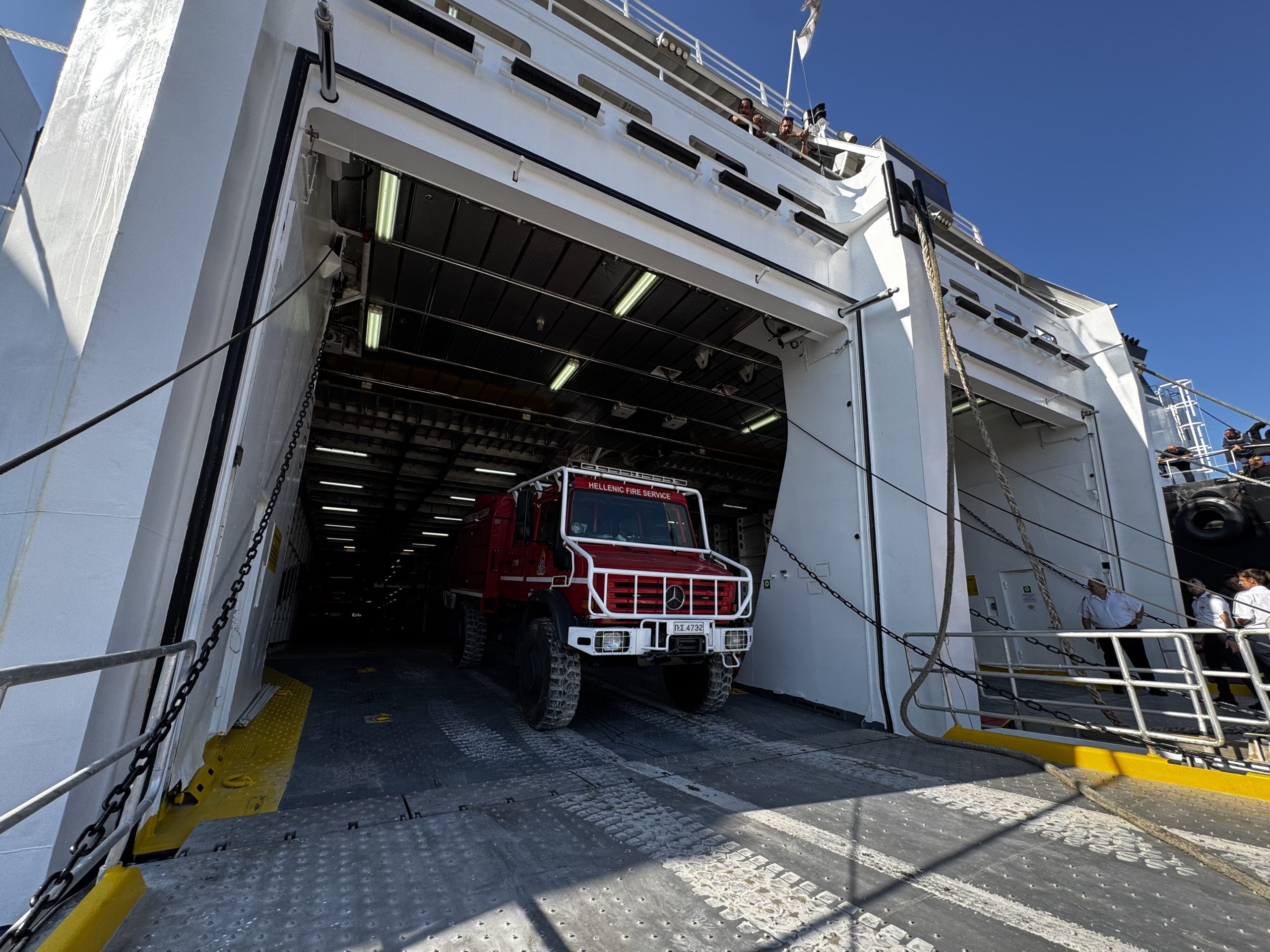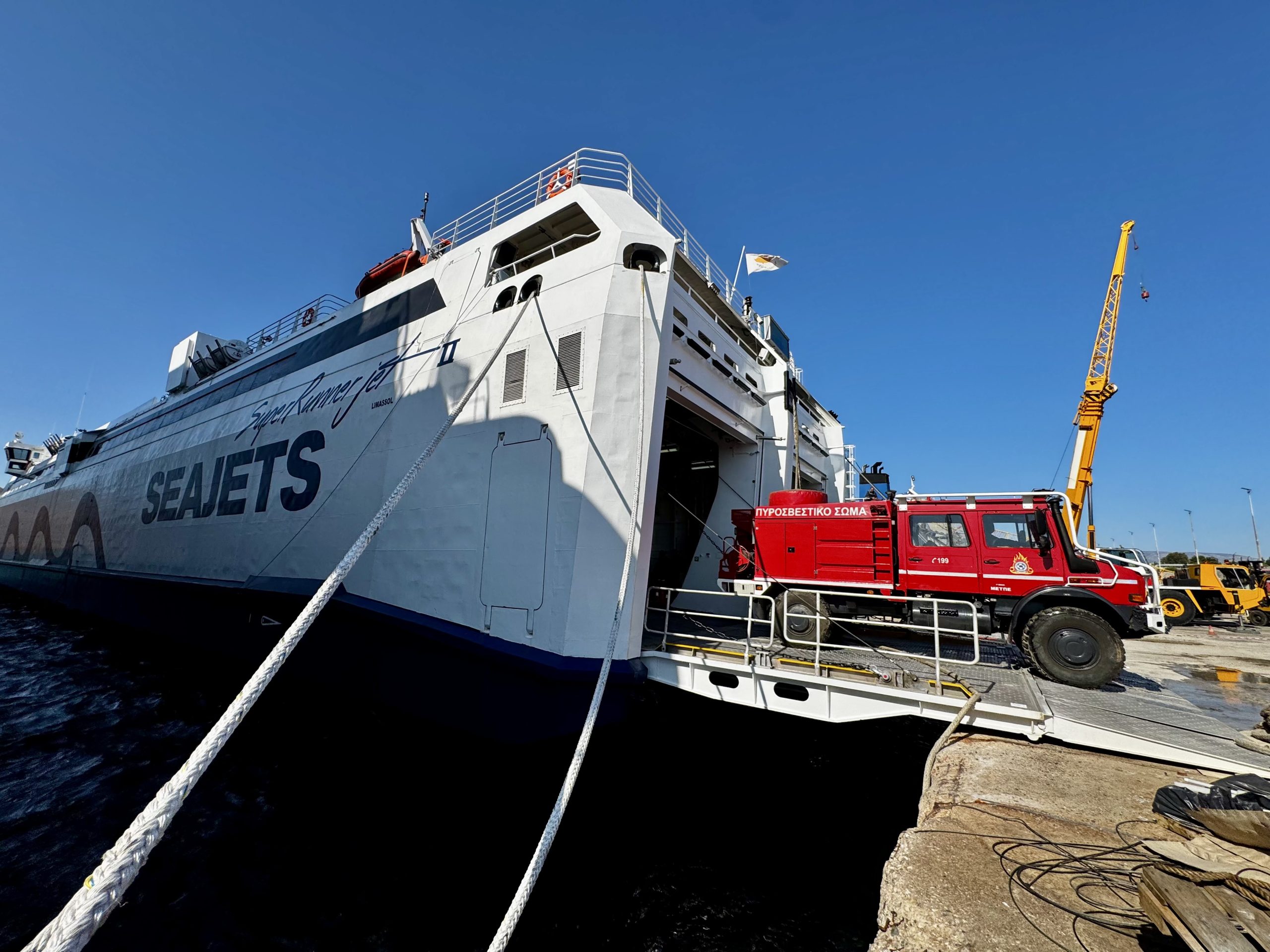 Λίγο μετά τις 18:00 χθες, απέπλευσε από τον Νέο Μόλο Δραπετσώνας το ταχύπλοο “SUPERRUNNER JET 2” της SEAJETS μήκους 110 μέτρων και ταχύτητας άνω των 30 κόμβων, μεταφέροντας ισχυρές πυροσβεστικές δυνάμεις και πυροσβεστικά οχήματα με προορισμό τη Χίο, προκειμένου να συνδράμουν στην προσπάθεια κατάσβεσης της μεγάλης πυρκαγιάς που μαίνεται στο νησί. Η SEAJETS ενήργησε άμεσα και μέσα σε μιάμιση ώρα από τη στιγμή του αιτήματος από την πολιτεία για μεταφορά, προχώρησε στις απαραίτητες ενέργειες προετοιμασίας και φόρτωσης του ταχύπλοου.