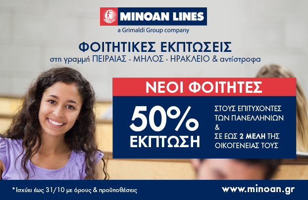 Για εμάς, στη MINOAN LINES, είστε ήδη φοιτητές – κι έχετε ήδη τα φοιτητικά σας προνόμια! Για ακόμα μία χρονιά, η MINOAN LINES στέκεται αρωγός στους πρωτοετείς φοιτητές που ταξιδεύουν στη γραμμή Πειραιάς – Μήλος – Ηράκλειο – Μήλος – Πειραιάς προσφέροντας 𝟱𝟬% έκπτωση σε όλες τις κατηγορίες θέσεων επιβατών* για τους ίδιους αλλά και για έως δύο μέλη της οικογένειάς τους, που τους συνοδεύουν για την εγγραφή στις σχολές και τη νέα εγκατάστασή τους, και βέβαια για την επιστροφή τους.