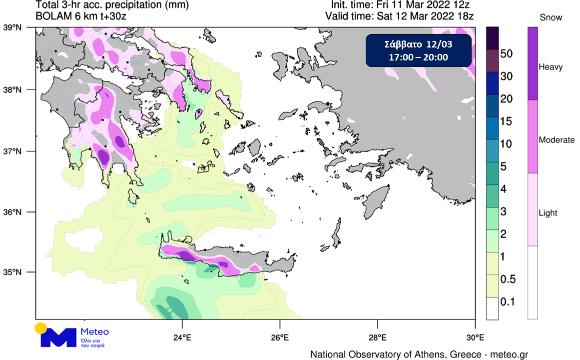 Όπως διακρίνεται στον παρακάτω προγνωστικό Χάρτη 1 (πάνω), τις πρωινές ώρες του Σαββάτου 12/03, αναμένονται χιονοπτώσεις στα νησιά του Βορειοανατολικού Αιγαίου, στη Χαλκιδική, στις Σποράδες, στην Εύβοια, καθώς επίσης και στην Πελοπόννησο. Οι χιονοπτώσεις σταδιακά θα επεκταθούν νοτιότερα και βαθμιαία από το μεσημέρι θα επηρεάσουν την Ανατολική Θεσσαλία (Μαγνησία), την Ανατολική και Κεντρική Στερεά, τα νησιά των Βορείων Κυκλάδων, τα ορεινά, ημιορεινά και βαθμιαία τα πεδινά της Κρήτης, ενώ θα συνεχιστούν στην Ανατολική Πελοπόννησο (Χάρτης 1, κάτω).
