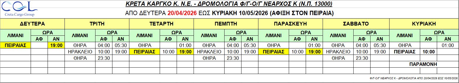 Φ/Γ-Ο/Γ “ΝΕΑΡΧΟΣ Κ”:  Σας γνωρίζουμε τα δρομολόγια που θα εκτελέσει το πλοίο μας από Δευτέρα 20/04/2026 έως Κυριακή 10/05/2026 ως κάτωθι πίνακας: