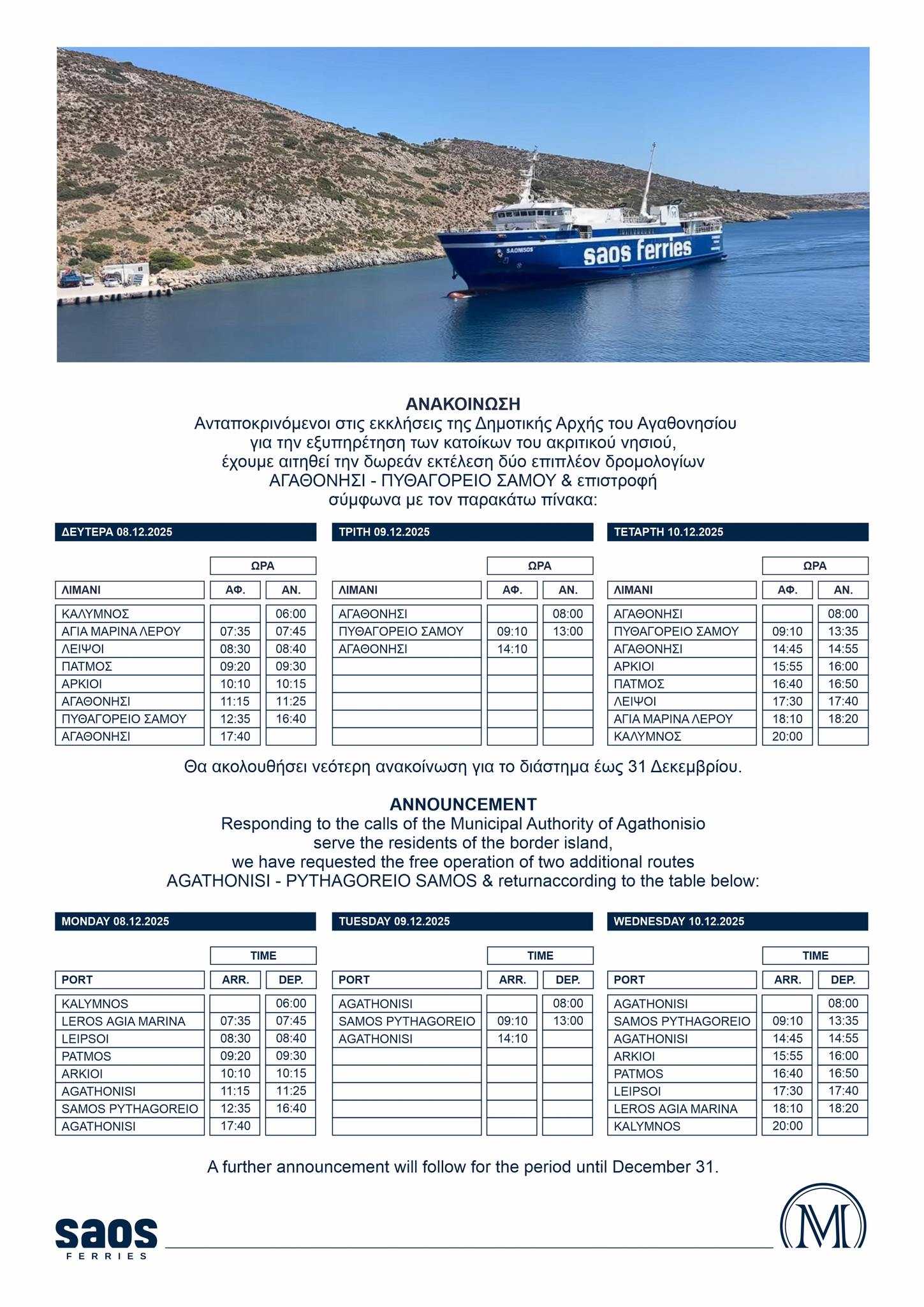 Αρχική Νέα Ακτοπλοΐα SAOS FERRIES: Επιπλεόν δρομολόγια στην γραμμή Αγαθονήσι-Πυθαγόρειο Σάμου για την εξυπηρέτηση του... ΝέαΑκτοπλοΐα SAOS FERRIES: Επιπλεόν δρομολόγια στην γραμμή Αγαθονήσι-Πυθαγόρειο Σάμου για την εξυπηρέτηση του ακριτικού νησιού 6 Δεκεμβρίου 2025 FacebookTwitterPinterestWhatsAppLinkedin ΠΑΡΟΜΟΙΑ ΑΡΘΡΑΠΕΡΙΣΣΟΤΕΡΑ ΑΠΟ ΤΟΝ ΔΗΜΙΟΥΡΓΟ Μήνυμα κ. Αρχηγού Λιμενικού Σώματος – Ελληνικής Ακτοφυλακής για την εορτή του Αγίου Νικολάου Ο ΚΑΙΡΟΣ ΤΗΝ ΚΥΡΙΑΚΗ 7/12 MAGIC SEA FERRIES: Από την πύλη Ε7 θα αναχωρούν τα δρομολόγια της εταιρίας από το Σάββατο 6/12 μέχρι το πέρας των εργασιών που πραγματοποιούνται...