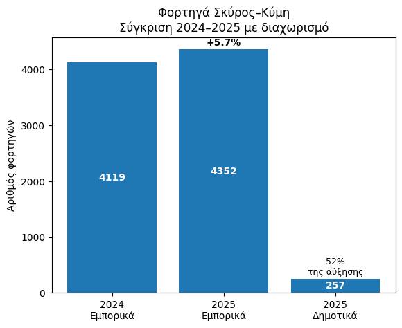 (Η συνολική αύξηση των φορτηγών κατά 11,9% οφείλεται σε σημαντικό βαθμό (6,2%) στη μεταφορά απορριμμάτων του Δήμου Σκύρου στον ΣΜΑ Κύμης, (257 οχήματα κατά το 2025).