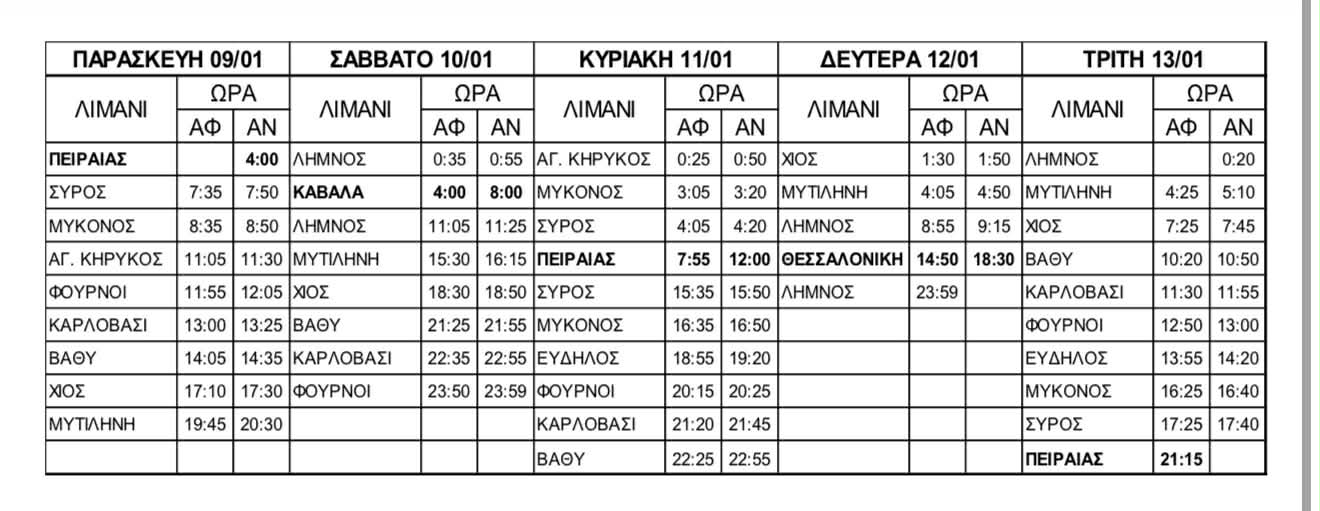 Ως εκ τούτου, εφόσον οι καιρικές συνθήκες βελτιωθούν, το πλοίο BLUE STAR MYCONOS θα αναχωρήσει από Πειραιά την Παρασκευή 09/01/2026 στις 04:00 (αντί την Πέμπτη 08/01/2026 στη 01:00) και τα δρομολόγια του έως και την Τρίτη 13/01/2026 (άφιξη Πειραιά), θα διαμορφωθούν σύμφωνα με τον παρακάτω πίνακα δρομολογίων.