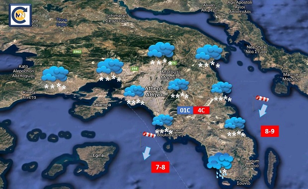 Για τον νομό Αττικής αναμένουμε νεφώσεις με τοπικές χιονοπτώσεις κυρίως στα βόρεια τμήματα του νομού . Από τις βραδινές ώρες τα φαινόμενα θα ενταθούν και θα έχουμε χιονοστρώσεις στο μεγαλύτερο κομμάτι του νομού . Οι άνεμοι θα πνέουν από βόρειες-βορειοανατολικές διευθύνσεις και θα φτάσουν στο Σαρωνικό τα 7-8 Beuafort ενώ στο νότιο Ευβοϊκό θα φτάσουν ακόμα και τα 9 Beaufort. Η θερμοκρασία σε χαμηλά επίπεδα δεν θα ξεπεράσει το μεσημέρι στο κέντρο των Αθηνών τους 4 βαθμούς Κελσίου αλλά στα βόρεια θα είναι 2-3 βαθμούς χαμηλότερη.
