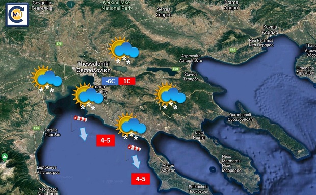 Για το νομό Θεσσαλονίκης αναμένουμε αρχικά αυξημένες νεφώσεις με παροδικές χιονοπτώσεις αλλά ο καιρός θα βελτιωθεί βαθμιαία. Οι άνεμοι θα πνέουν από βόρειες-βορειοδυτικές διευθύνσεις φτάνοντας στον Θερμαϊκό και τα 5 Beaufort ενώ η θερμοκρασία στο κέντρο της πόλης δεν θα ξεπεράσει τον 1 βαθμό Κελσίου.