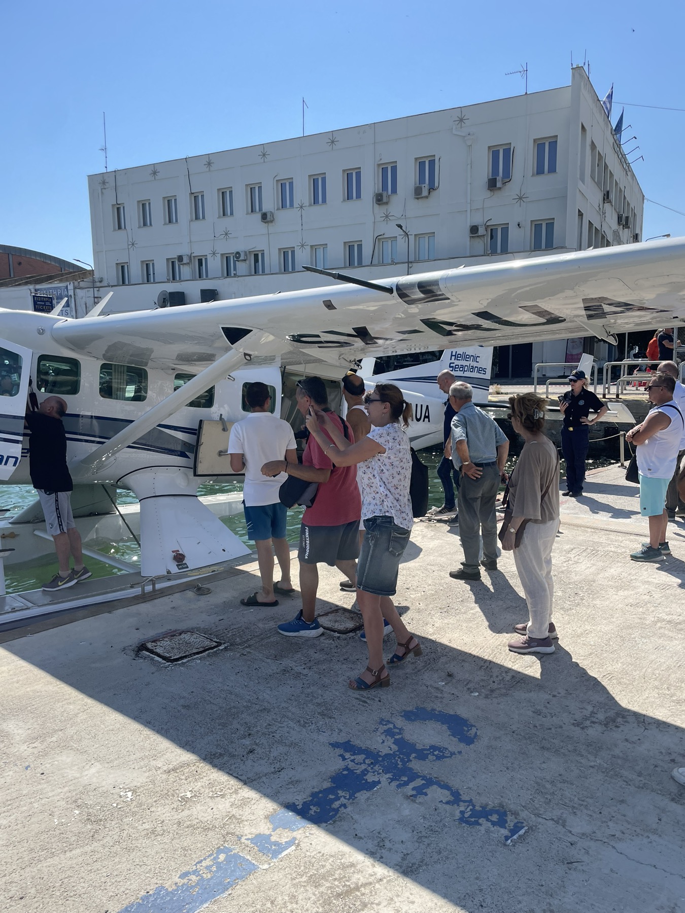 Το υδροπλάνο της εταιρείας προσέγγισε την κεντρική προβλήτα με κομψότητα και ακρίβεια, μπροστά στα έκπληκτα βλέμματα του κόσμου που είχε συγκεντρωθεί για να δει από κοντά το φτερωτό μέσο που ετοιμάζεται να ενώσει τον Βόλο με τις Σποράδες, τη Σκύρο και άλλους προορισμούς.