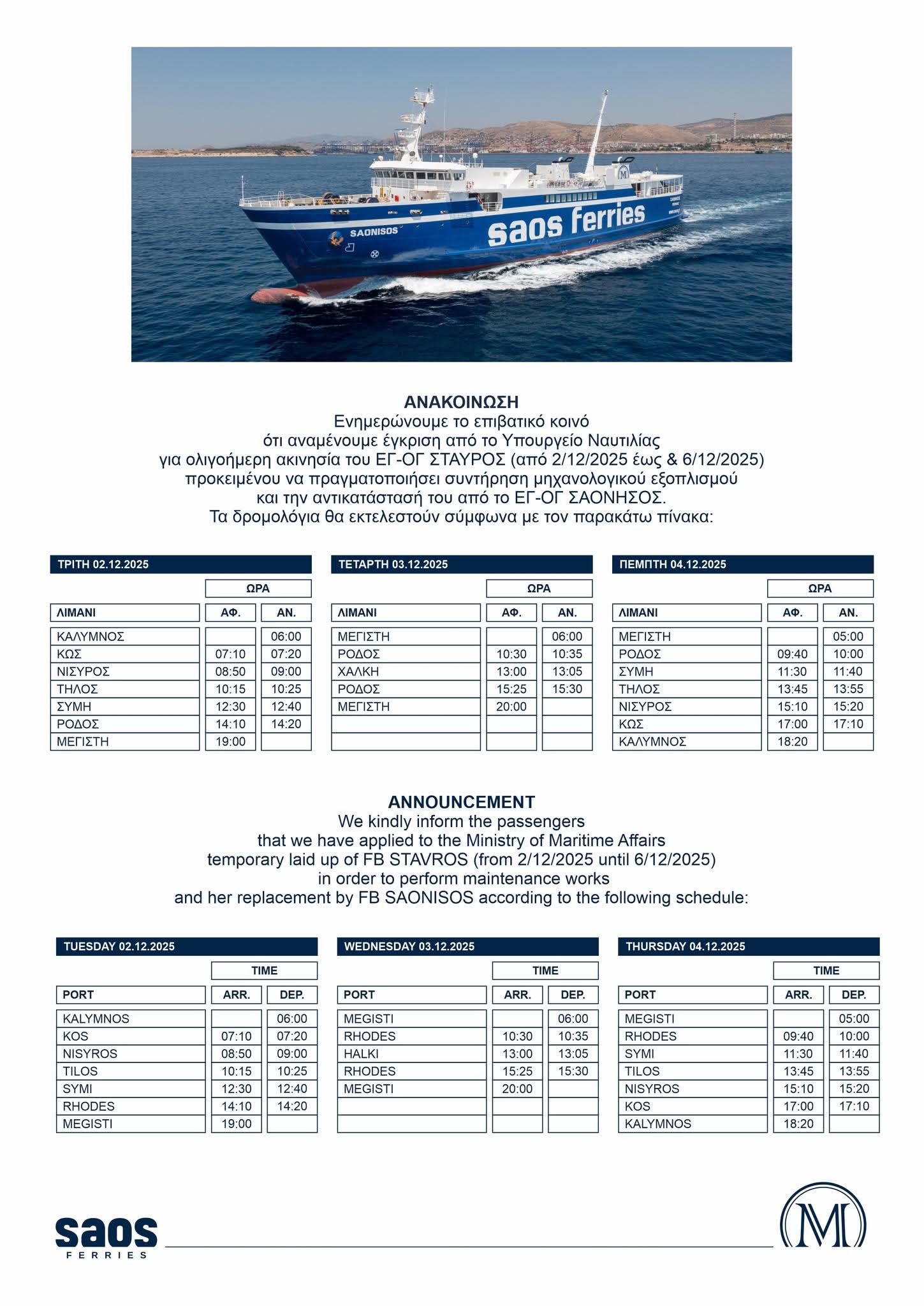 Αρχική Νέα Ακτοπλοΐα Το ΣΑΟΝΗΣΟΣ θα αντικαταστήσει το ΣΤΑΥΡΟΣ , το χρονικό διάστημα 2/12-6/12, λόγω... ΝέαΑκτοπλοΐα Το ΣΑΟΝΗΣΟΣ θα αντικαταστήσει το ΣΤΑΥΡΟΣ , το χρονικό διάστημα 2/12-6/12, λόγω της ετήσιας ακινησίας του 1 Δεκεμβρίου 2025 FacebookTwitterPinterestWhatsAppLinkedin ΠΑΡΟΜΟΙΑ ΑΡΘΡΑΠΕΡΙΣΣΟΤΕΡΑ ΑΠΟ ΤΟΝ ΔΗΜΙΟΥΡΓΟ Από την πύλη Ε8 θα πραγματοποιούνται οι αφιξοαναχωρήσεις του ΠΑΝΟΡΑΜΑ από την Παρασκευή 5/12 Ο ΚΑΙΡΟΣ ΤΗΝ ΠΑΡΑΣΚΕΥΗ 5/12 Διαμόρφωση του δρομολογίου AKKA προς Βενετία στις 04.12.2025